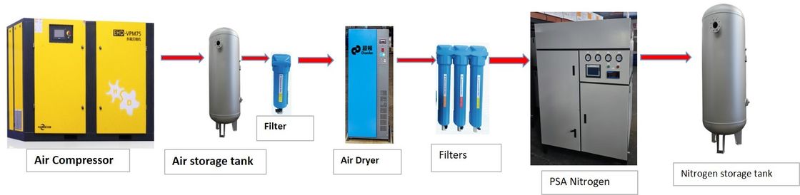 المواد الخام لمولد النيتروجين PSA هي الهواء ، والذي هو وفير ومتاح بسهولة. يستخدم المولد جرسًا جزيئيًا لفصل جزيئات النيتروجين من الغازات الأخرى في الهواء.تم تصميم النظام لإنتاج النيتروجين عالي النقاء بمستوى نقاء يصل إلى 99.99%