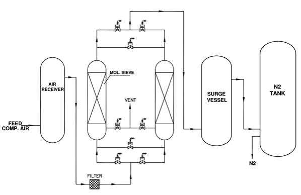عند تشبع كمس في السفينة، عملية تحويل الجيل النيتروجين إلى السفينة الأخرى، في حين يسمح السرير المشبعة بدء عملية الامتزاز والتجديد. يتم تفريغ غاز النفايات (الأكسجين، وثاني أكسيد الكربون، وما إلى ذلك) في الغلاف الجوي.